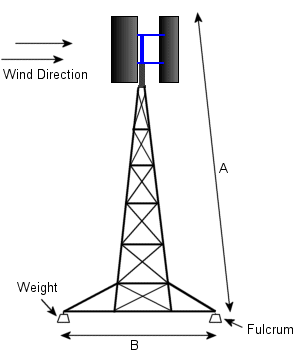 If I remember correctly, the fact that the tower is vertical and the base is horizontal is largely immaterial. You can "straighten" it out like a standard lever+pivot. It then becomes ratiometric. Do you REALLY mean the windmill is 5 metres, square? (Ie, 25 square metres of area?). I'll assume it's bad phrasing and you mean 5 square metres :) Converting to the next contributors formula, 5m^2 = 54 square feet. Lets assume a wind gust of 100KMH (62MPH), Force on the turbine would be .00492 x 54 x 62^2 = 1021 lbs = 463Kg force. Round it off to 500Kg :) If your mast is 8m high, and the base was 8m wide and it pivoted on the corner, you would have that 500Kg acting at the "other" side. 8m high and 4m wide, you'd need 1000Kg to hold the bugger down. 8m high and only 2m wide (more like the proportion you've drawn) you'd need 2 tonnes to hold that puppy down! (Or have I made a fatal flaw in my assumptions somewhere?) |