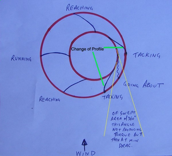 If you've ever done any sailing you'll immediately understand the terms and aerodynamic profiles. In basic theory this should produce torque for most of the 360deg.