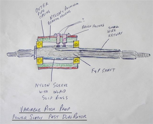 The prop hub mounted motor is still the best option for dual rotor mills yet we still have the problem of getting power to it past the rotor. A hole down the shaft doesn't help as we end up on the wrong side of the rear rotor and no better off. I just can't see a way of supplying power to the prop of a dual rotor mill.was working fine... til the smoke got out.