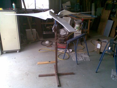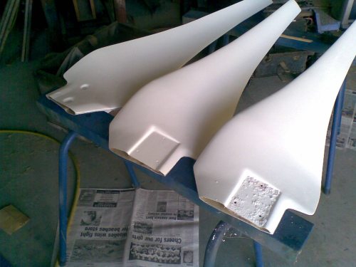 Trev dropped off a set of the new fibreglass blades on his way out of town on holiday. The blades were not finished, he didn't have the time to glue on the end cover plate or sand back the glue along the leading and trailing edges.