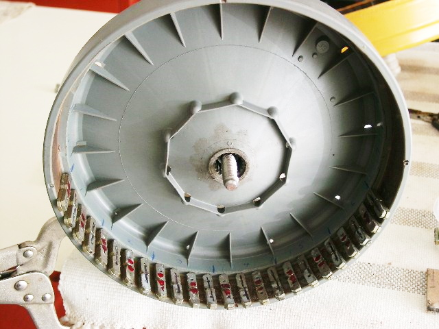 looking good so far, how did you remove the original ceramic magnets? i have some magnets comming soon, was thinking of using a brake drum, is that the old steel bands still in place? im getting 6mm magnets it looks like you have 2, 3mm together so should get similar results. interesting to see results martin free power for all McAlinden WA |