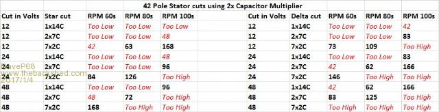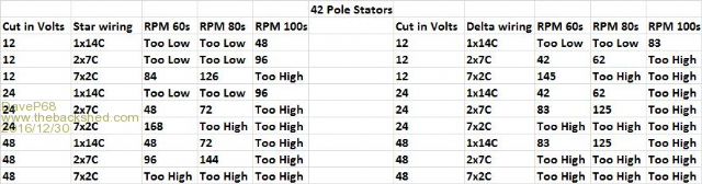 Hi Phill Where it states "Too Low" I mean a Cut in RPM of 12, 18, 21, 24 or 36" I have included 42 RPM on the Delta side so should have said 42. It's there for all to see on the Delta table anyway. For "Too High" Cut in RPM I'm really referring to above 192 rather than the 165 (there is a 168 in the table). I just so happens 192 is the next highest RPM level above 168. So I chose not publish it and anything above that. Here are some Examples of "Too Low" RPM cut in levels; 60s Star 12V Cut in RPM's are: 1x14C is 12, 2x7c 24 That is way too Low. 80s Star 12V Cut in RPM's are: 1x14C is 18, 2x7c 36 still too low. Here are some Examples of "Too High" RPM cut in levels; 60s Star 48V Cut in RPM's are: 7x2C is 336 RPM That is way too High. 80s Star 24V Cut in RPM's are: 7x2C is 252 RPM That is too High. 100s Star 12V Cut in RPM's are: 7x2C 336 RPM That is way too High. 100s Star 24V Cut in RPM's are: 7x2C 672 RPM That is off the charts too High! 100s Star 24V Cut in RPM's are: 2x7C 192 RPM too close to your 200 RPM limit. As it turns out Calculations are derived from measuring the Volts at various RPM levels. Example a 42 pole 60s factory standard star is around 1 VDC per RPM out of a 3 phase rectifier. So 100 VDC out is around 100 RPM +- a volt or so (no load). 80s is 66.6% (2/3) of 60s and 100s is about 25% of a 60s (1/4). It's just simple math to create the tables. All very predictable when the stators are not under load which is exactly where cut in happens. Remember these RPM numbers are "cut in" values and don't represent the higher RPM operating range (above cut in) that power is "going" to be extracted from. I'm going to leave the data table as it is. Not wanting to cause any confusion to those who are new to here and that is exactly why I published in that format. David There are realities if you do not accept, will lead to frustration because you will be spending time on wrong assumptions and the results cannot follow! The Dunning Kruger Effect :) |