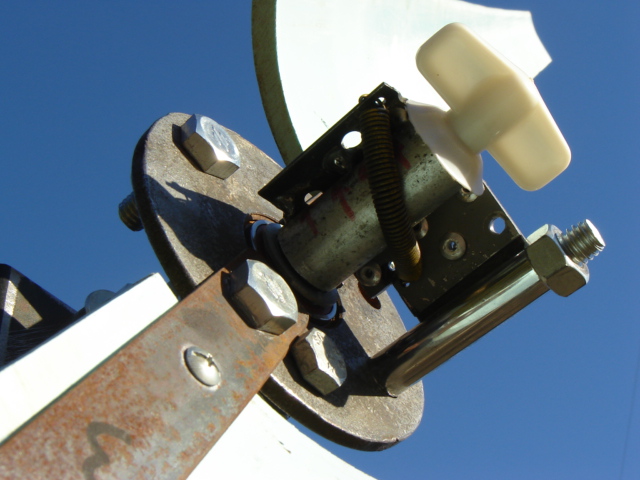 The testing is nowhere complete, there are only two PVC blades (bad!) instead of three, the tower was only a three meter (10') effort and there is "she who must be obeyed" and demands a restoration of the house and not playing with my mill! But do not hesitate to comment on it; this method is called a floating hub, I suspect and is not a product of my overly fertile imagination.