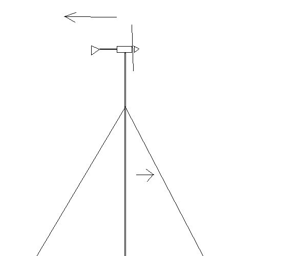 Whatever you decide with a guyed pole I think you need to get the guys as high a possible without fouling the blade tips. As this little diagram shows pressure on the mill causes the pole to bow in the direction of the lower arrow. |