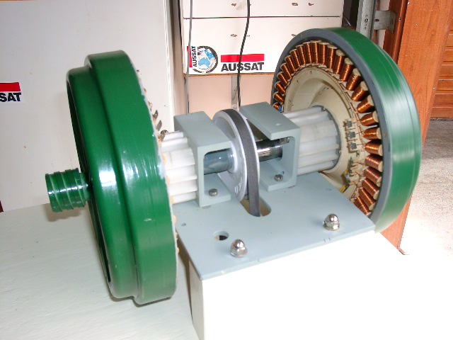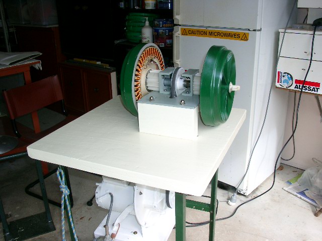 Hi Crew,, I've finally finished making a test bed for testing different re-wires of Stators and running up Neo Rotors .. I'll make an adaptor to fit the Seeley motor also -- With the gearbox (old floor polished) and 1.5 hp motor ,I get 400 rpm ..This can be changed by different pulleys .. Runs smooth ,just the normal gearbox noise.. Bushboy |