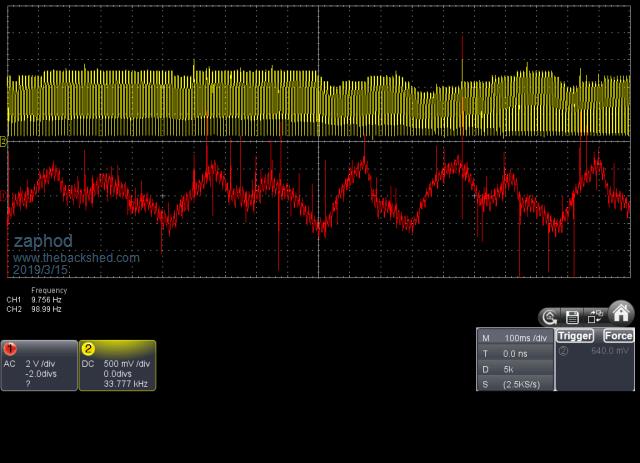 The problem was resolved as usual in both hardware and software, firstly the stored energy was increased something like from 30-130 Joules to give the relatively slow booster time to catch up with load changes and then the CSI regulator was changed in several ways but most importantly to limit the slope of increasing power. As shown in the scope shot below this has been quite successful, CSI power is in yellow and DCbus ripple in red.