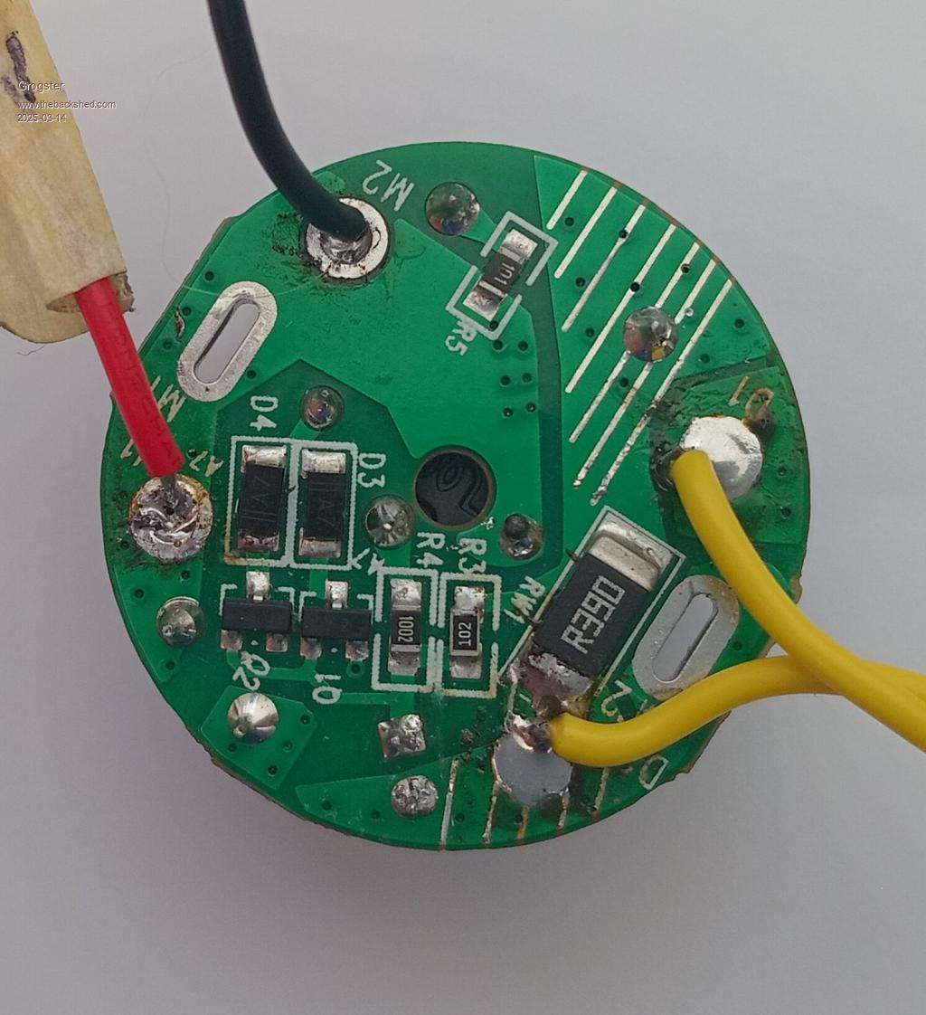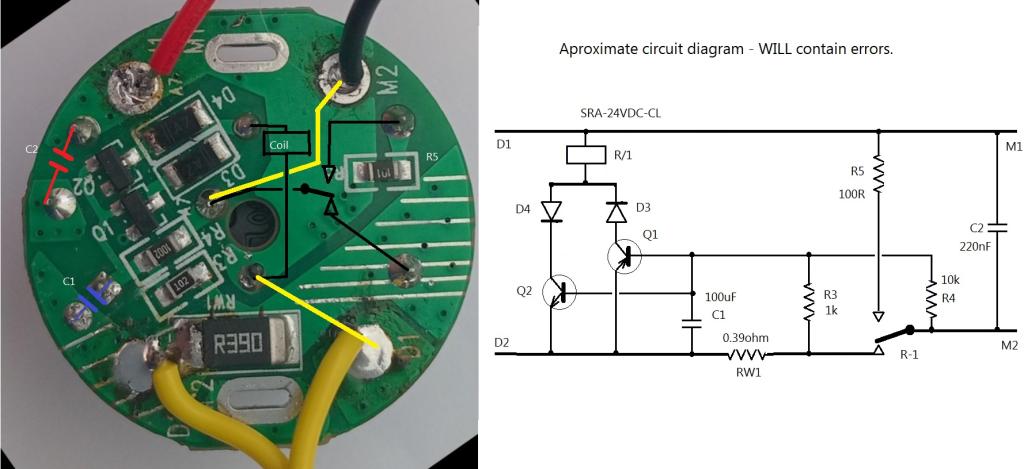 The blue electro is 100uF/35v, the red poly is 220nF directly across the motor as some form of suppression.