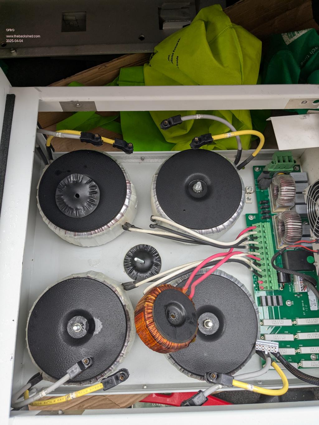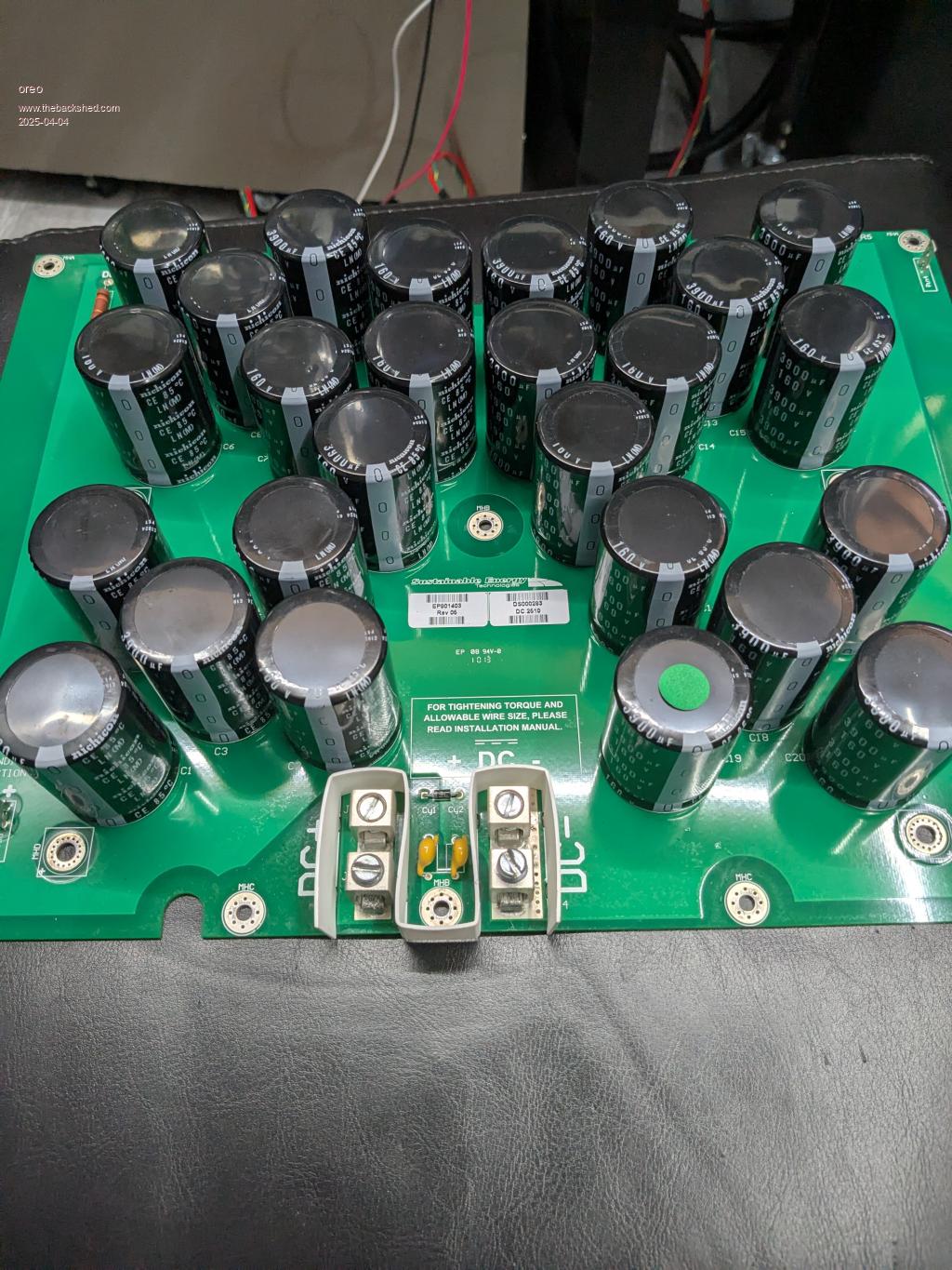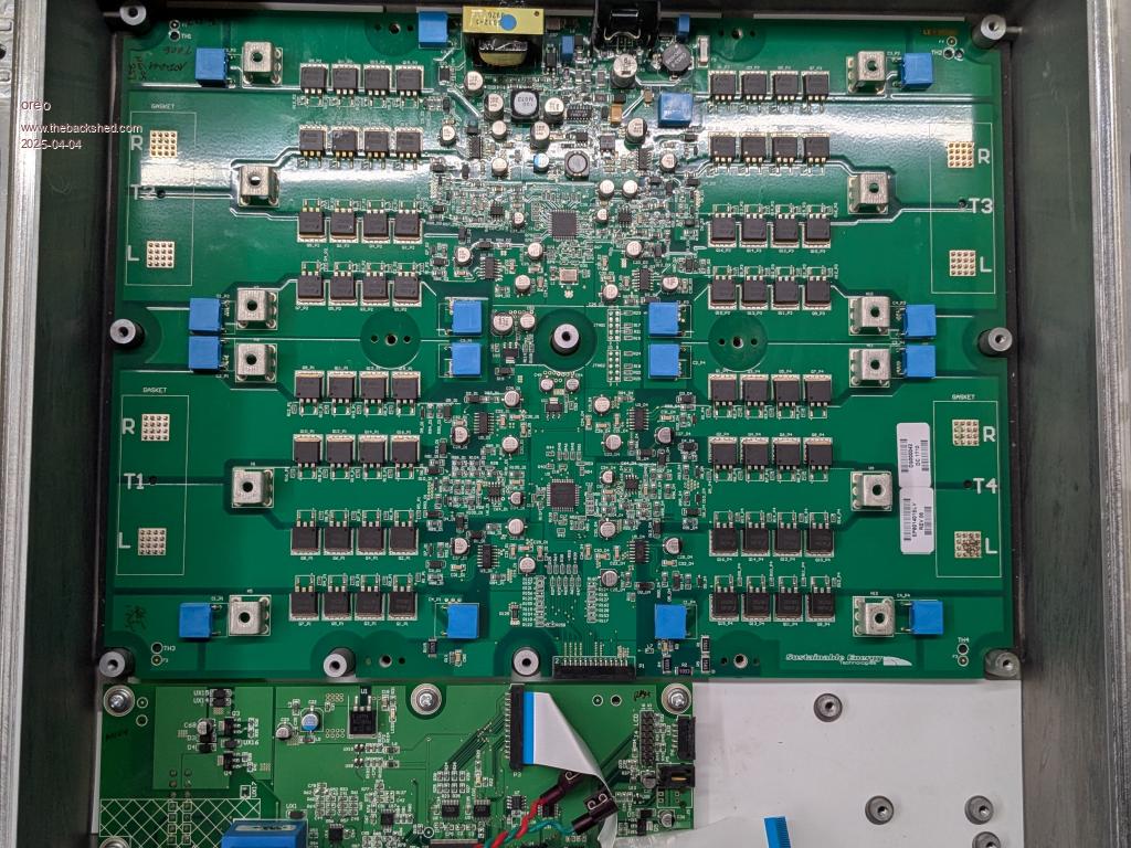 I am normally on the lookout for scrap inverters, but normally do not run into much around here (Canada). Recently I saw a Tie grid inverter that looked interesting. Looking up the specifications it's rating is: MPPT input voltage 54-95VDC 208VAC 5kw continuous 63Kg weight, 10yr warranty standard, 20yr warranty optional No one would want this, since residential supply here is 240v split phase not 208 and this inverter is 14yrs old. It has a real low MPPT input voltage range, and since my battery is 72v nominal the transformers might actually work for me (not that I really needed more transformers, but anyway that's not the point right?). So I got an good price and brought it home yesterday. It has an all aluminum chassis and is made up of: An input capacitor board with 25pcs of 3900uF 160v ![]() A board with 4 inverter sections, each using 4 sets of 4 150v 180a mosfets. ![]() And a transformer section with 4 toroid transformers and 2 1mH chokes and a filter board. ![]() Greg |