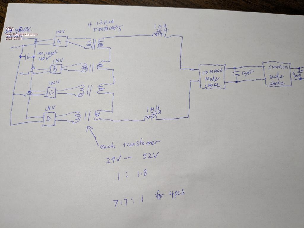 And now the interesting part (s). 1. There are 4 separate inverters (ok, maybe not that interesting) 2. The transformer outputs are connected in series (not parallel) 3. Between the inverter output FETs and the Transformers, there are no inductors! I jotted down a block diagram/schematic. ![]() So they put the inductors after the transformers but before the filter capacitors. I have not see this before. Maybe it only works with smaller power transformers IDK. Thoughts? Greg |