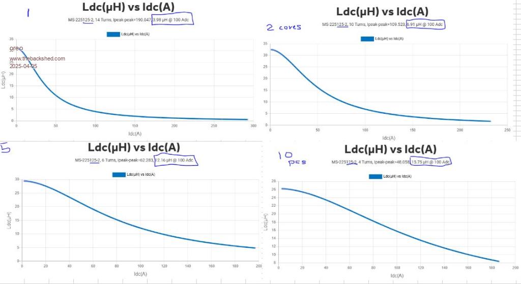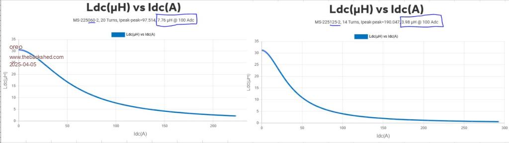 Greg FYI I ran some calculations on the KeepIS chokes and this is what I worked out. I was looking at their values at around the Bsat point but note the Bsat was at 400A for the blue but only ~ 200A for the black ones. 2 x blue stacked 276Al, Ae= 4.5742sqCM = 4.4uH for 4Turns and 415A at 1T Bsat 4 x Black stacked Al=1148 Ae=9.1484sqCM = 18.5uH for 4Turns 198A at 1T Bsat Intuitively a total of 22.9uH @ 198A @1T reducing to ? at 415A a bit more than 4.4uH a lot less than 22.9uH As you have two of these the 22.9 doubles to 45.8uH @ ~200A, but reducing to maybe 10 to 15uH at ~ 400A I did these calcs quite a while ago, it is not too dissimilar to your work despite the inductance being higher for when he was running 6 cores not nine, so why were they not higher for nine? My Al values were for Molypermalloy (MPP) which are normally Blue, for the Black I used KoolMu data. After re-reading this not sure if it is helpful or not.... Edited 2025-04-06 10:10 by wiseguy If at first you dont succeed, I suggest you avoid sky diving.... Cheers Mike |
