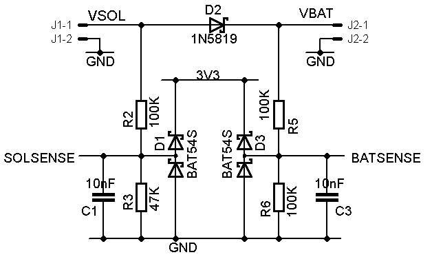 Battery voltage drops to about 5.2V overnight but as the sun comes up, in today's blustery weather with bright bits, VBAT comes up as usual to about 5.4V with VSOL occasionally hitting 5.8V. I sense both solar and battery voltages through potential dividers with D1 and D3 clamping anything nasty to the supply rails and then onto AIN pins, applying a multiplier in the prog to give "real" voltages. All works nicely, but we are coming up to maximum daylight and I am wondering about six months from now when we might be lucky to get 8 hours of heavy overcast.