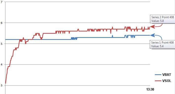 I am conscious of the voltage drop across D2 and sure enough the trend shows the expected 0.3v-ish difference between VSOL and VBAT (of course VSOL will be dragged down towards VBAT as it tends to short circuit). Clearly this is very blunt and I don't have space or $$$ for some MPPT controller (hence NiMh cells which are quite forgiving).