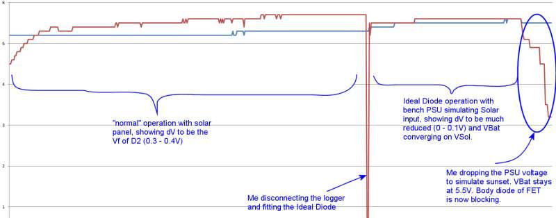 I have the ideal diode built and ready to go and at 10mV it is almost the short-circuit that I seek. 10mV out of the panel's 6V (although unlikely) is 0.16% loss - way better than the 5% (probably much worse) I am getting now. I have been watching the traces this morning and it grinds my gears to see dV (VSol-VBat) at just +0.2v and know that nothing is going into the battery, whereas with a "short", the battery would be sucking every last joule from the panel - I aspire to that.