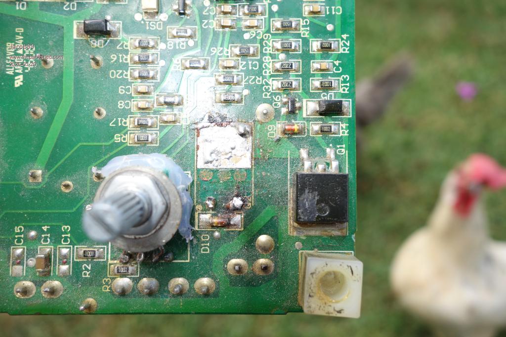 I replaced the potentiometer with the closest replacement I could find. This worked fine for a while and then the wire feeder stopped working at all. I pulled the PCB back out and found one of the two mosfets that make up the speed controller had blown apart.