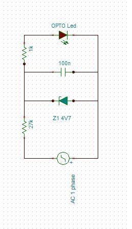 The combination of 27k series resistor to the 0.1uF ceramic cap and 4V7 zener gives a good square wave drive to the opto LED. through the 1k limiting resistor. The zener gives asymetric clamping of the AC to form the sharp square wave, and prevent reverse bias to the opto LED.