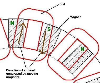 hands will. the fingers create alternate pole faces that pass the stator coils and the coils are wired to output 3 phase. the Regulator controls the Load.---Cheers,Roe