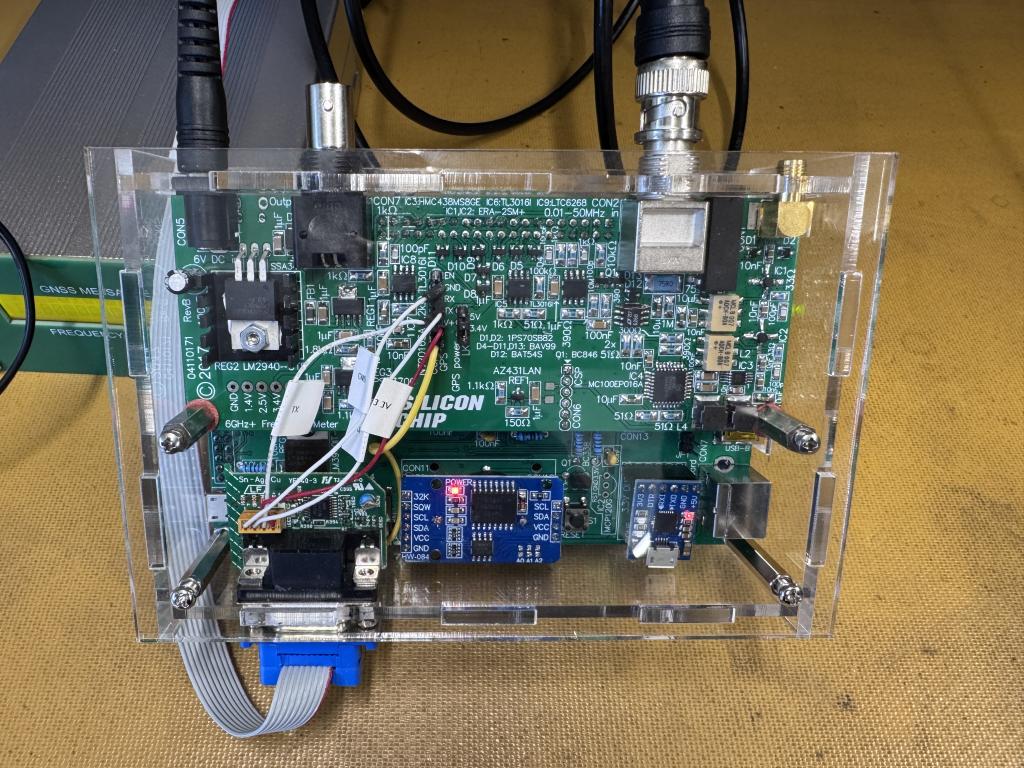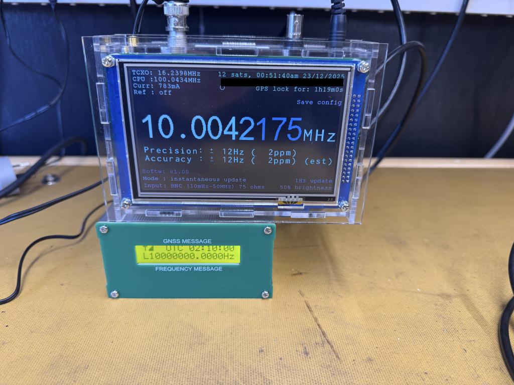 I have one of the Tamed GPS oscillators with a 10MHz output and using it as the GPS source via the NMEA serial and 1PPS I can plug that into the counter. It eventually after an hour it settles down adjusting the TCXO too much and reads around 10KHz high. The revised code still does a small glitch every 15min or so which surprisingly gets the counter within about 1-2Khz but it slowly drifts out, maybe temperature related, so I will have to look into that.