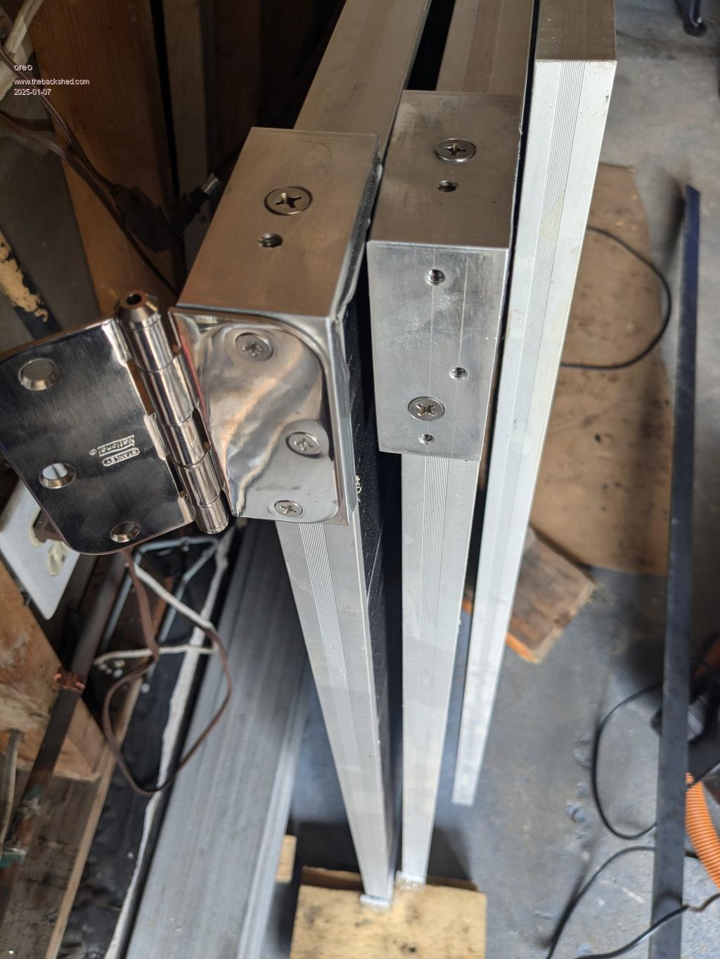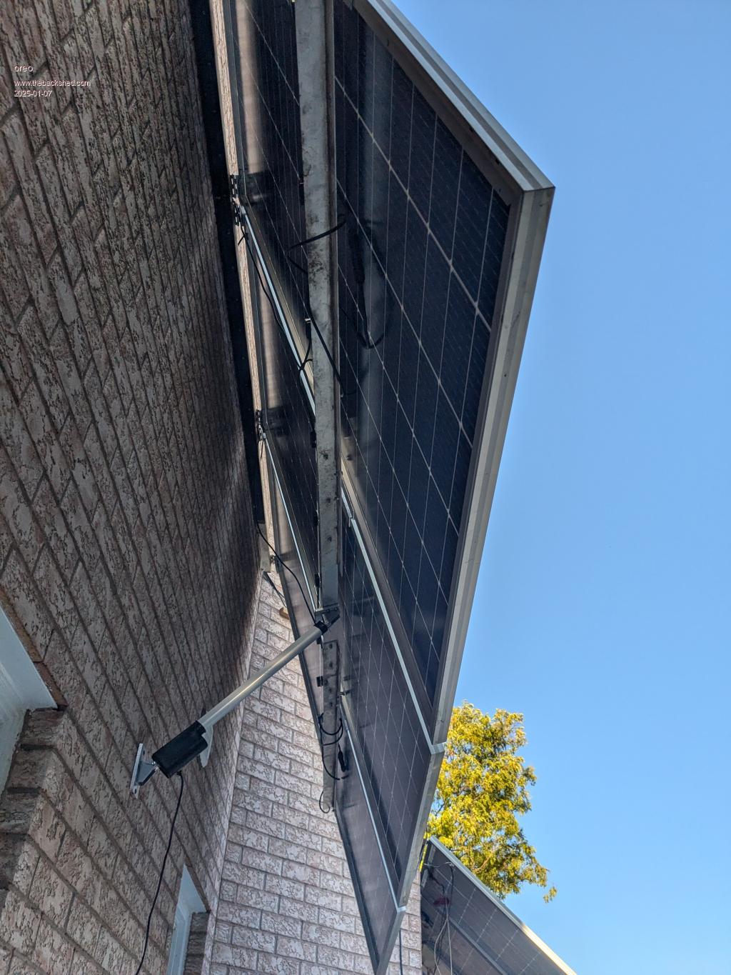 Hmm. Sorry lizby, I forgot to respond to your question. Yes, 180 means south facing and 128 about southeast. Since my last post, I found a website SunEarthtools.com which allows you to calculate and show the sun's position for your location and at different times of the year. My old panels were actually at 135D and 165D. At this time of the year, the sun is very low and rises at about 120D. So I am getting no direct sun at this time of the year unfortunately. I did mount 3 of the new panels over an exiting shed on this same wall that faces 135D. I had to remove the roof of the shed to get up there, and then realized I needed to use a linear actuator to change the ground angle, since I don't have access after the shed roof has been installed. Anyway, this array of 3 panels is not doing too much at this time of year, because a nearby 2 story house is shading part of one of the panels. By next month this will improve greatly as the sun will be higher in the sky. So to mount these panels, I mount 2 hinges on one end of each panel. I strengthen the aluminum where these 2 hinges are, using L aluminum and epoxy. The hinges get mounted to the wall and by using different sized struts at the other end of the panel, I can adjust the vertical angle of the panel for winter and summer. Hinge attachment ![]() These panels are quite heavy at 71 pounds plus, so I needed to figure a way of getting them up on the wall. I attached a pulley wheel to my ladder, and used a manual winch attached to an old dresser with some automotive weights to keep it on the ground. ![]() ![]() I used a 20" stroke linear actuator from Vevor which is supposed to be IP67 rated (It does not look like it). I initially intended to mount the actuator to give me the 40" of stroke I need, but I miscalculated and put the mount in the wrong spot. I ended up putting the actuator in the most convenient spot. I may redo things next year... ![]() ![]() So for now, I have 3 new panels and 3 old panels in a 3S2P configuration. The old panels have a MPP voltage about 10v less than the new panels, and they are the most dominant panels at this time of the year. So not ideal. I won't be getting around to installing the other 3 new panels, until the spring. Greg |
