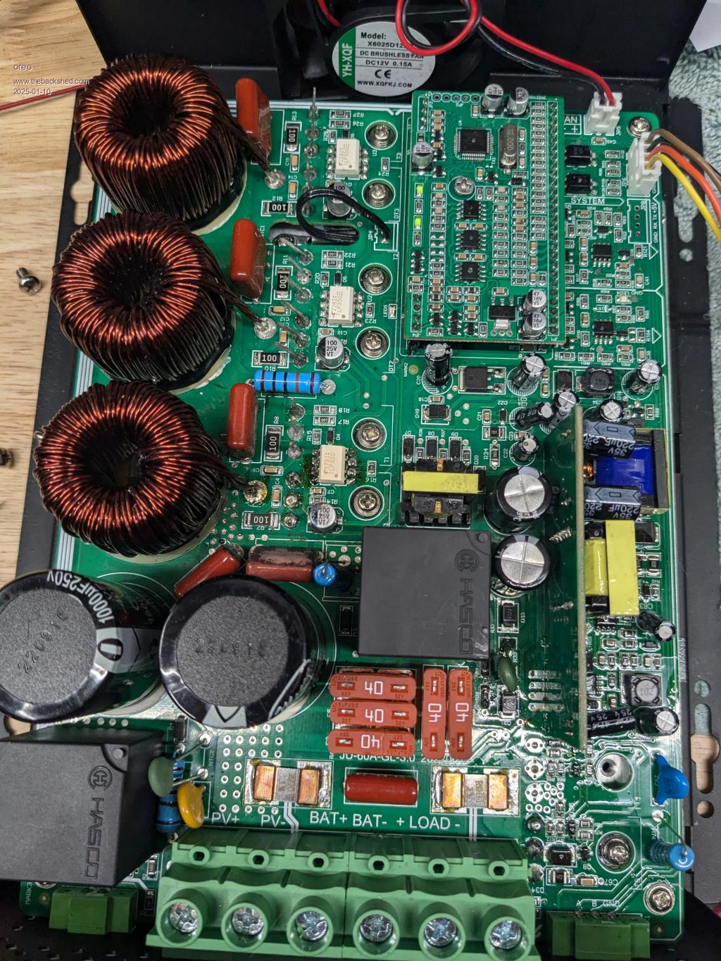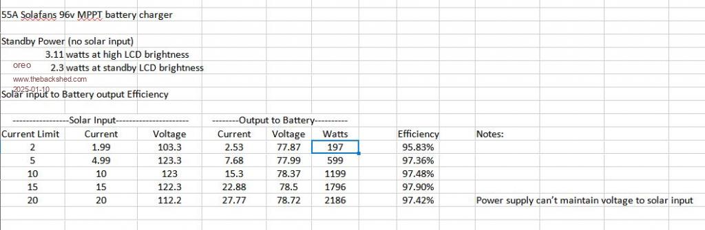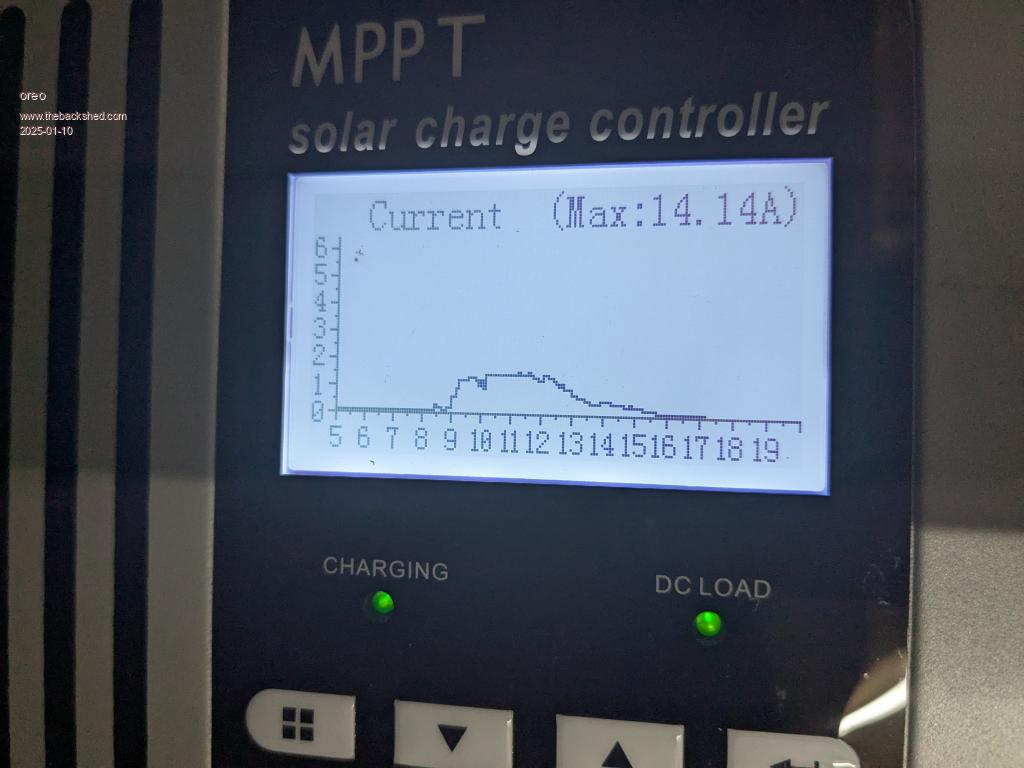 ^Thanks Otto. I think the panels themselves work well, but with reduced sunlight and snow and clouds, the output can be considerably less. So after deciding to mount my solar panels in groups of 3, I figured I needed to buy or build a MPPT controller. Fortunately there are more low end MPPT commercial units around which support 72v systems. Amazon carry a brand called Solafans which was the lowest cost and had reasonable ratings. They cleared out some lower current versions, so I bought one. I did some testing and found (with my tools anyway) that the efficiency is pretty good. Not sure how close you can run this to 55A, but I really only need 30. The power part of the MPPT uses a very similar circuit to Poida's thread, except it uses 3 inductors and for each inductor, one dual diode and mosfet. I thought at first that the unit was only using one inductor at lower power levels, but the board had a conformal coating, I I was just not pressing hard enough with the scope probe. When I pressed hard, I managed to short the ground tab on the probe, to one of the switching transistor/diodes and managed to vaporize the leads. Fortunately it only killed the Mosfet driver chip, and I happened to have one in a bad inverter on hand. ![]() The unit has a relay on the input and output, so the output relay did not energize, due to the circuit fault. So thus far this month, I have averaged 2.8Kw per day into the battery with a maximum of 4.69kw today. It was a perfect day, being very cold with very few clouds. ![]() At this time of year, this is enough power to run my gas furnace blower motor. So I need an utility powered battery charger which I can run at night. Greg |