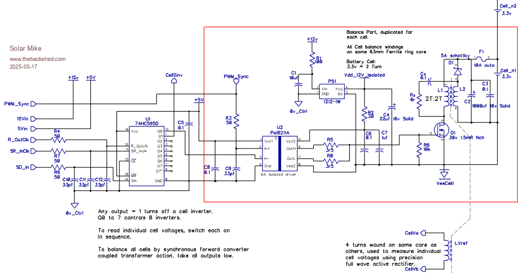 Here is a partial schematic for each cell, it uses an inexpensive mosfet isolated driver (Pai8211A) and 12-12v 1w isolated psu from LCSC. A shift register is used to turn off\on the cell inverters as required; they can be easilly linked to control another bank of 8 cells.