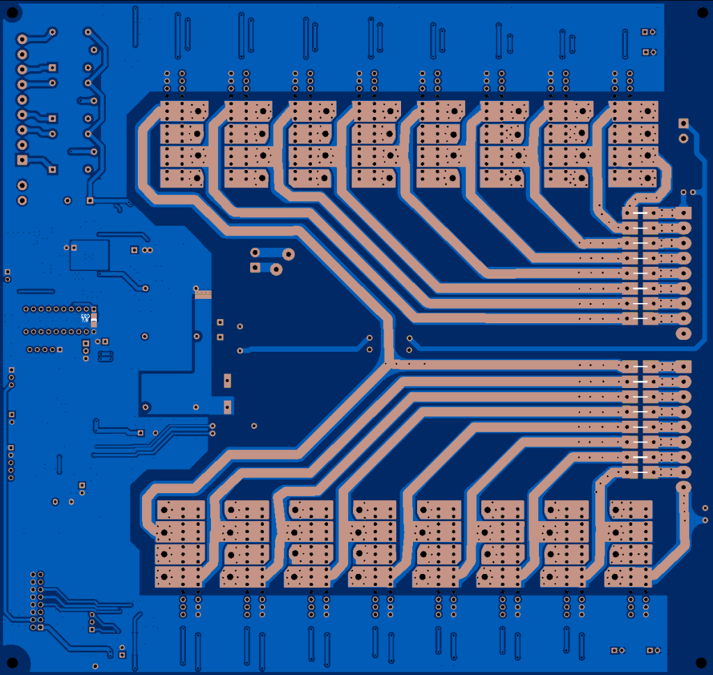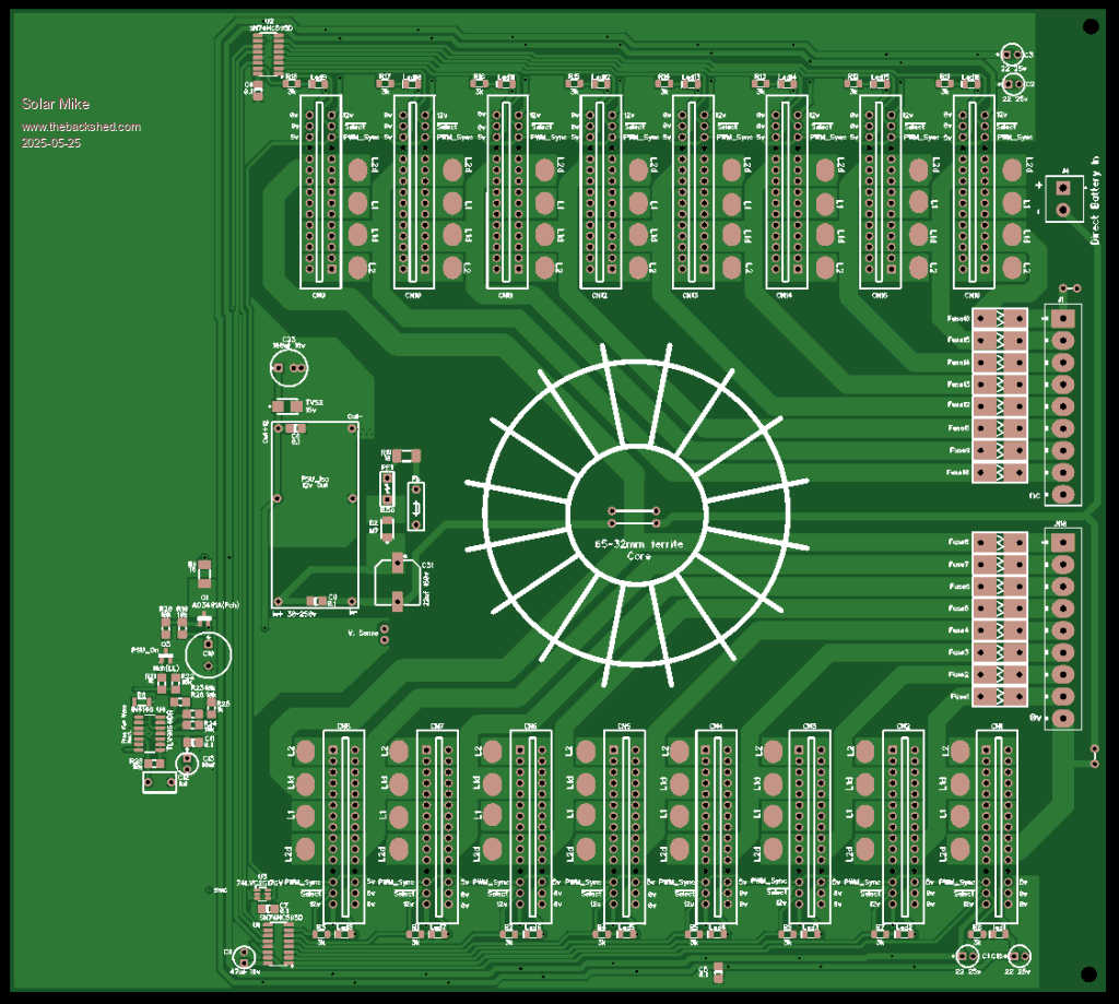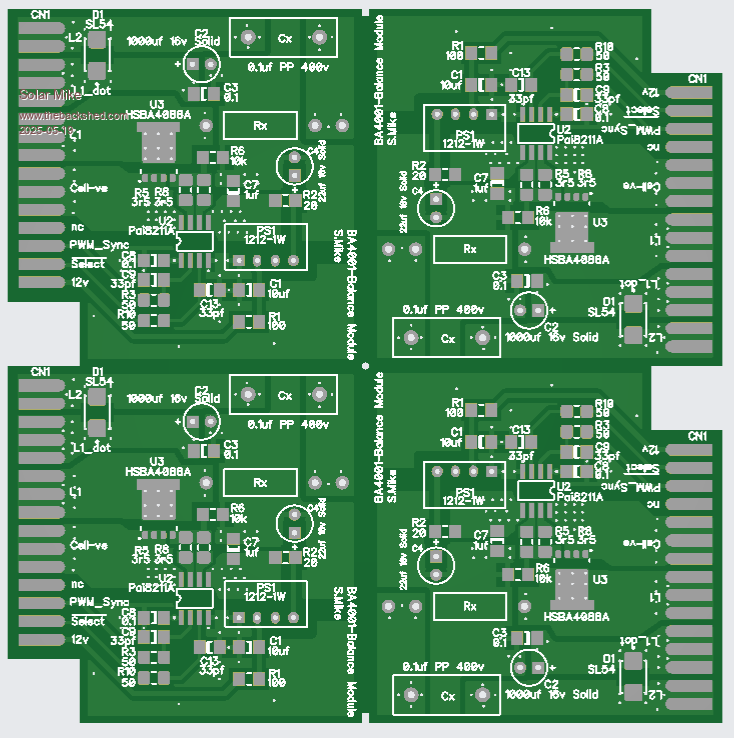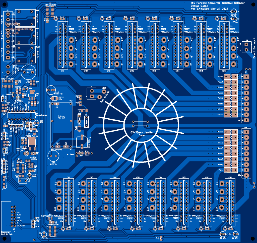 Have made the mother board extendable, so a second board can be connected, minus power supply\CPU, to allow another 16 cell modules for a 100 volt Lifepo4 setup. If I wind a number of turns on each core and join the two cores together, then that should allow balancing across all cells, due to the synchronous switching.