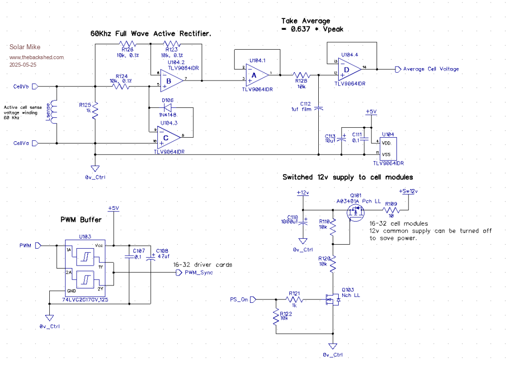 The 60 Khz cell reference winding for measuring individual cell voltages goes to an active full wave rectifier, then an averaging filter, I'm using a 10Mhz OPamp here TLV9064.