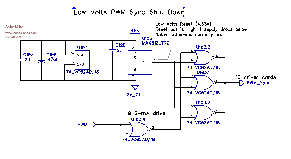 To prevent this, have added a MAX810LTRG 5v rail monitor and some logic to shut down the PWM sync drive should the 5v rail ever drop below 4.63 volts.
