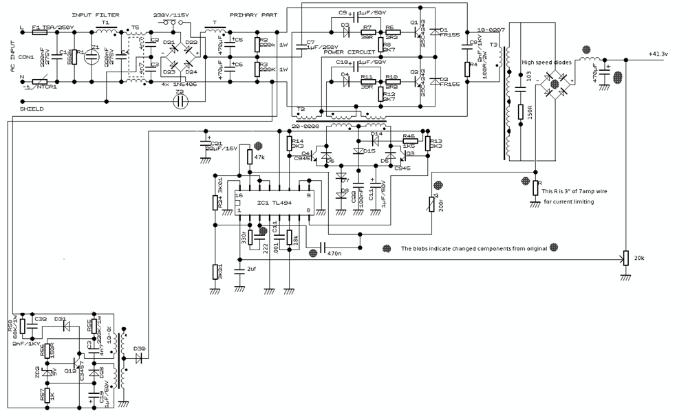 In the schematic, we are interested in keeping all the HV stuff, and only keeping the 494, it's oscillator cap and resistor, the totem pole trannies...and supporting gear.... ie the caps and diodes and resistors(follow pins 8 and 11) and then C21 and D30 in the LV side of the flyback supply for Vcc for the 494, and thats about it. All the rest is useless.