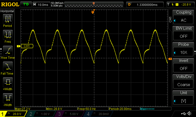 At about 12-13V applied to the power board the a/c output starts and the output wave is shown below. Increasing supply voltage >13v causes current draw to increase above 500mA (tried up the 1A so not just on the margin). The wave form looks like its missing one quarter (would look OK if it was not missing). Any suggestions where to look. Checking the Power board for something around the wrong way?