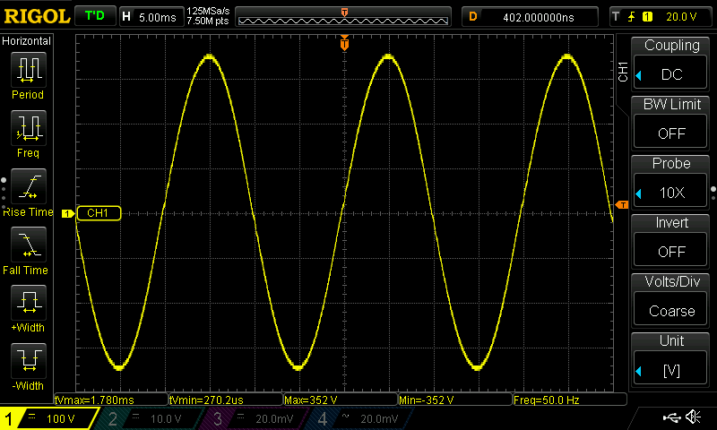 Yes measuring AC output. The vertical 0 is where the 1> pointer is on the screen grab above. AC or DC couple shows the same thing. There is no earth connection on the AC output except when the DSO probe is connected.