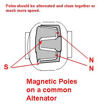 I looked at the rotor that came out of the original alternator and it has a total of 14 poles. The size(width & thickness) of magnets I was using will not allow for spacing of 14 around the circumference and still fit in the original stator. Is it OK to drop 1 or 2 magnets out and go with 12 or 13 instead? Also if I only drop 1 out I would end up with two adjacent mags of same polarity but would provide the most allowable number of magnets. I guess I'm a little confused on the polarity & significance of it. I've seen some very small generators (science project) that make poles all the sameLink to example (pg 11 & 12). What is the difference between using same poles vs alternating poles? Thanks!! |