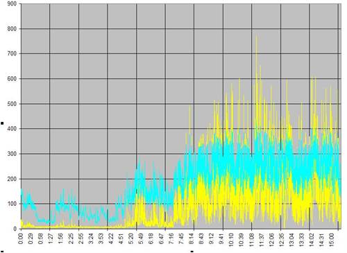 From the lack of informed responses to this question I will provide some good reasons why mechanical switching of a dynamic windmill system is likely to end with failure of mechanical components. You really have to ask ?? Is there a successful commercial implimentation of star delta switching? Here is a graph of a typical windmill output in a 15hour operation window. There was about half the time with low winds, and the other half was variable/reasonable winds. rotor RPM is the teal coloured graph, and output power is the yellow graph. There were many wind gusts during this recording window. There are approximately 2000 RPM transitions through a set point of 180rpm. Now, if I had a relay, star/delta switching system, it would be required to change the windmill wiring configuration 2000 times. I will let the readers think about this a bit, and it will be obvious why I have chosen a switchless arrangement to achieve the optimum loading on my windmills. Gordon. become more energy aware |