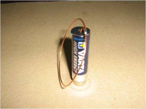 Place the copper ring onto the battery so the bent end sits into the hole in the tape and the bottom of the ring touches on the magnet.
