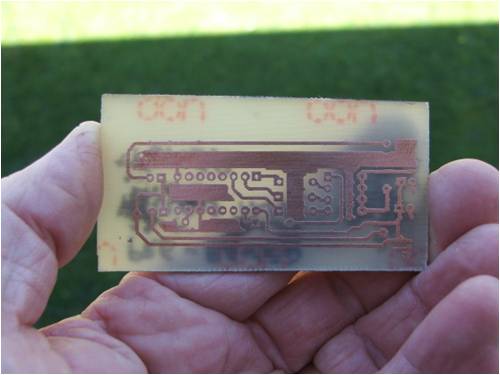 Remove from uv and develop in a solution of caustic and water ( 7 grams of caustic in 1 ltr water.) till all the green film is removed between the tracks.