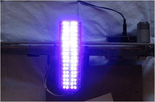 About 20 ultra bright UV leds ( from China ) supply the uv light and the leds chug up and back several passes over the print to expose it then switch off.