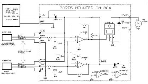 this cct performs a similar function to my first dump load controller. I used a single 74c14 chip though as the amplifier. The sensing component was a logic level FET. I still have this cct working on windmills systems in remotes parts of SA. They are 24V, and the relay is a SSRelay type.