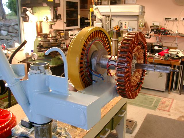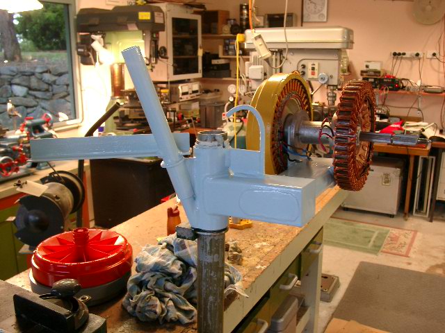 I've sort of finished my new direct drive platform apart from fitting the blades to Trev,s blade hub. In the pic you can see Trev's cast bearing holder and modified spline(extended) on the s/s drive shaft. This bearing arrangement allows for 2 stators and rotors to be fitted on the single shaft,maybe I can off-set one against the other to sort of maybe cancel out the cogging, we'll see. Bruce Bushboy |