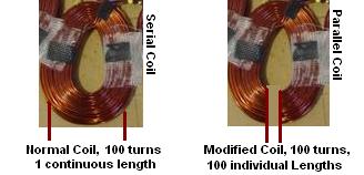 Using the coil on the left for example is a normal coil, but it is really just many single windings all hooked in series, so I will refer to it as a serial coil. The one on the right has been cut at one end and as in the picture has had the ends wired together so that all the single loops are wired in parallel.
