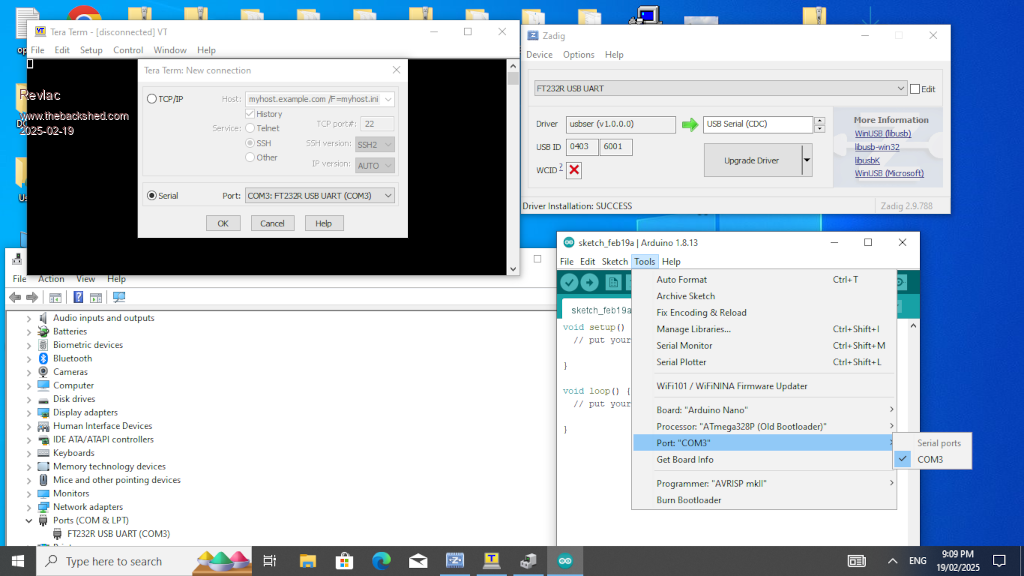 I got the Tera Term installed (on my widows pc) and running after a few attempts, now I see the com port is greyed out and not able to be selected, so went back to Arduino IDE to find its also greyed out, however it did have a little text at the lower right corner about the nano being plugged into com3 so it knows its there, I then tried another blank nano same thing happens, so checked drivers and no errors or problems, these are new nano's with that tiny micro USB port.