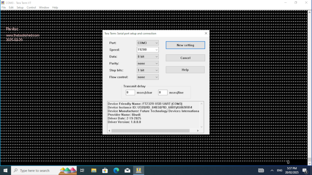 Another thing to check is the serial port speed (after removing the above jumpers). Factory fresh nanos are often 57600 baud, so set TeraTerm to that. While you are in Serial Port Setup set the character delay to 0mS and the line delay to 5mS. The bottom of that screen will show details of that port.