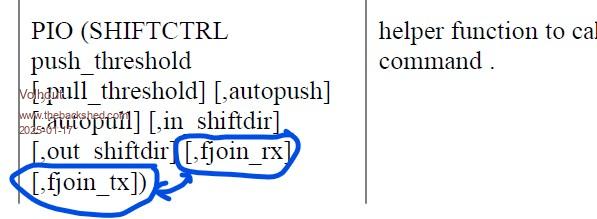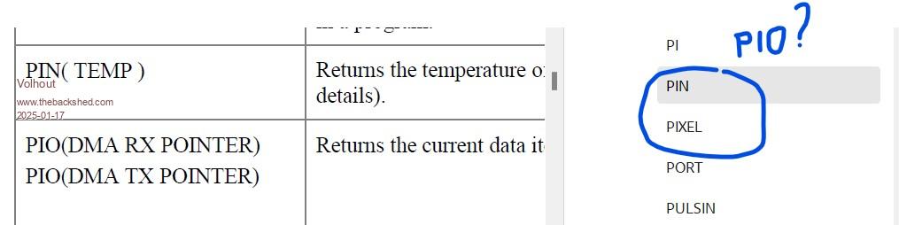 Hi Geoff, The 6.00.01 user manual could use 2 small changes. 1/ PIO does not appear in the function list ![]() 2/ There is a difference in the PIO(SHIFTCTRL ) helper function. The bits for fjoin_rx and fjoin_tx are swapped (join 2 PIO fifo's into one larger fifo). This should be corrected in 2 locations to match the released 6.00.01 firmware. location 1: the function table ![]() location 2: the appendix (page 189). ![]() Volhout PicomiteVGA PETSCII ROBOTS |