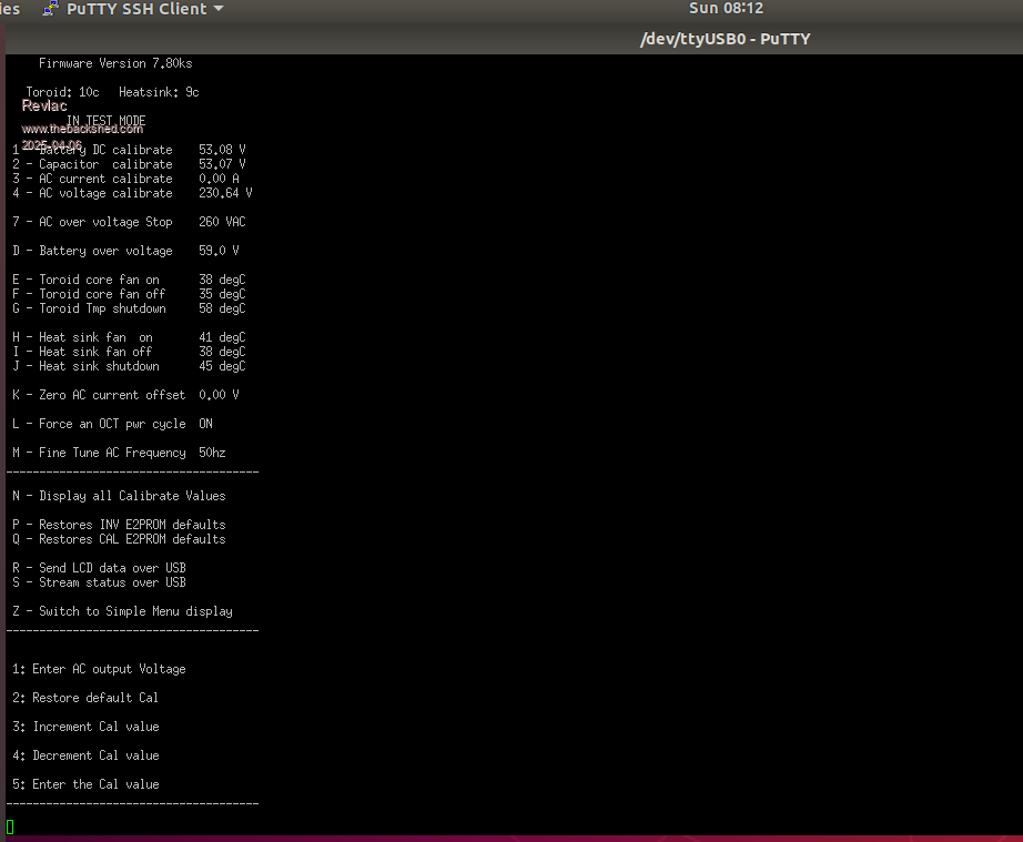 Now I did some of the Calibrations this morning using PUTTY on the Ubuntu PC (the Windows one still not happy) it works a bit like Tera Term, but haven't figured it out completely yet, when selecting menu items it will scroll down the list to where it should, but I couldn't enter the battery calibrations, typing in the new value, it had a flashing courser but no numbers appeared when typed, will probably sort that out later, but no problem I used the increment and decrement a few times and it worked a treat......All Good.