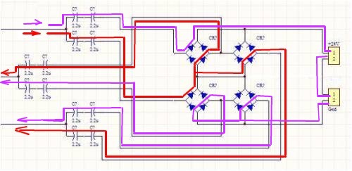 I note the caps in the shorted legs (red)are in parallel with the load and all current passing through them is lost to the battery. Once saturation of the red caps is achieved, the seriesed caps(violet) will then pass current and this circuit includes the battery. Back-to-back caps in series and parallel and called a voltage doubler???? You don't seem to be aware of any of the processes at work here. But so long as you are happy with the results. Gill EDIT: Haa! I see now. On the negative 1/2 cycle the former serisied caps are now in shunt and are charged to saturation then the former saturated shunt caps are now in series and discharge as a charge pump through the battery. The voltage is effectively doubled. OK. So why don't you explain it simply without all the crap? was working fine... til the smoke got out. Cheers Gill _Cairns, FNQ |