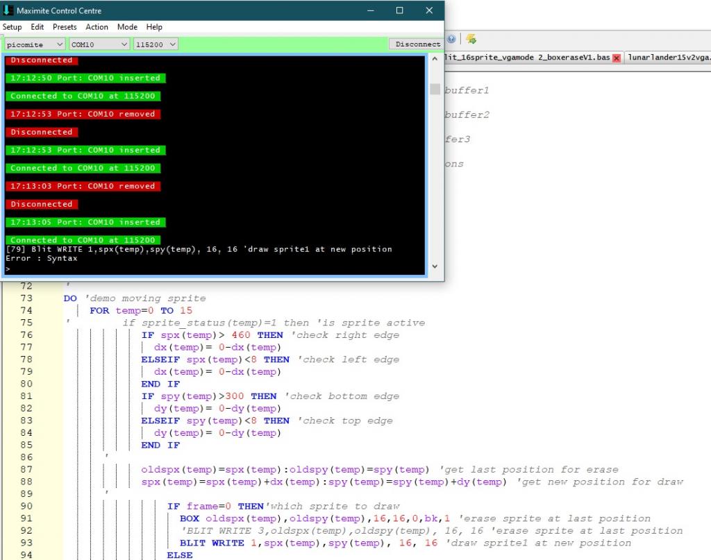 Can I ask here or new thread? I tried an existing prog for ili9488... it's 480x320 so must be and blit write now gives syntax error using picomite usb. There was mention of sprite instead of blit working in betas but all too dynamic to keep up to date. The ili9488 did work with this on a final release. it's picomite rc3 usb ![]() Edited 2024-04-14 02:54 by stanleyella |