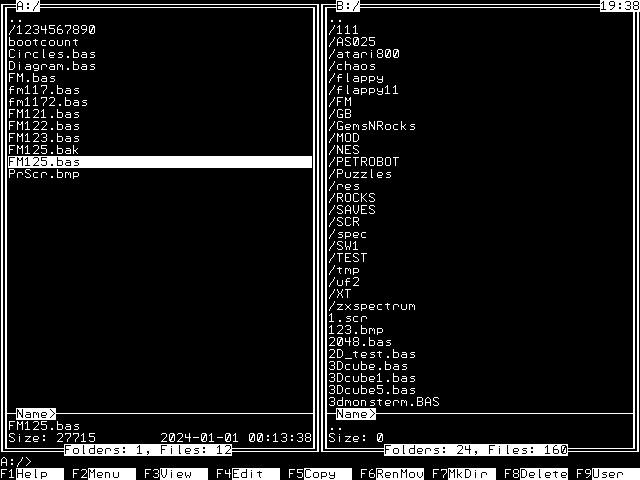 FM v1.3 for PicoMiteVGA/HDMI The original code has been refactored. I brought some order to it. - File sorting for panels has been added. - The file renaming function has been moved to F6 - Now F2 calls up a menu of built-in subroutines that can be developed (I made a couple of examples). - The F9 button now has a user menu of commands that the user can add to the program at the beginning. (commands executed in the program and commands executed in the command line, including options). - The user can also type any command while in the File Manager and it will be executed. ![]() FM13.zip I haven't gotten around to copying and moving entire directories, multiple file selections yet, I think I'll do that next. I'll take a look at how @twofingers does it, Thanks to him. I propose to develop this version of the file manager. Suggest ideas for the built-in routines menu. Write your own examples of such routines. Thank you all for your attention! I'm still alive, the fight continues! Glory to the heroes! Edited 2025-03-10 04:33 by javavi |