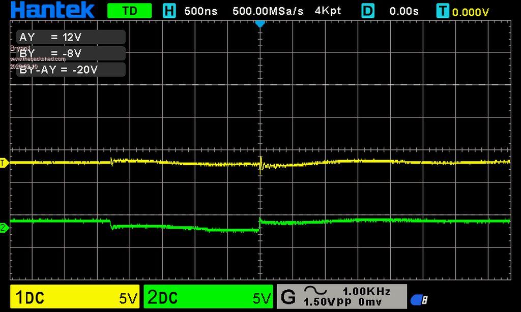 More scope captures: Third scope capture: probe 1 to LO1, probe 2 to HO1. Set scope H to capture 1 to 3 cycles of 50H. Position Base lines of CH1 and CH2 separate from each other to distinguish 0 volt of LO1 and LO2. Fourth scope capture: probe 1 to LO1, probe 2 to HO2. Set scope H to capture 1 to 3 cycles of 50H. Position Base lines of CH1 and CH2 separate from each other to distinguish 0 volt of LO1 and LO2. |