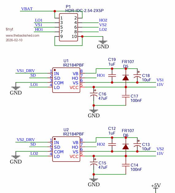 I am just going by files in my archive and the testing direction from the EGs002 document. Experts here, please review my instructions. ![]() For stand alone testing, I think you temporarily connect VS1 and VS2 to GND. Scope Channel 1 and Channel 2 to DC, not AC. First scope capture: probe 1 to LO1, probe 2 to LO2. Set scope H to capture 1 to 3 cycles of 50Hz. Second scope capture: probe 1 to HO1, probe 2 to HO2. Set scope H to capture 1 to 3 cycles of 20KHz. Edited 2026-02-10 12:49 by tinyt |