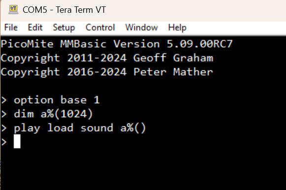 Here we are, back in Venice with more ... Play LOAD SOUND. What am I doing wrong? PicoMiteVGA MMBasic Version 5.09.00RC5 Copyright 2011-2024 Geoff Graham Copyright 2016-2024 Peter Mather > LIST ' Print "Test for PLAY LOAD SOUND v00.bas" Option base 0 Dim a%(1023), b%(4095), n% For n% = 0 To 4095 b%(n%) = n% Next Memory PACK b%(), a%(), 4096, 16 Do Play LOAD SOUND a%() Play SOUND 1, B, U, 440, 25 Print "a%() now playing" Pause 500 Play STOP Pause 200 Loop End > > RUN a%() now playing a%() now playing a%() now playing a%() now playing [16] Play STOP Error : Unknown command > |