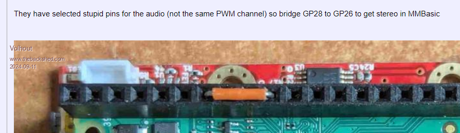 no. The thread has many pages, my bad. got this to mess with option reset olimex PicoMiteHDMI MMBasic Version 6.00.00b6 OPTION FLASH SIZE 4194304 OPTION KEYBOARD US OPTION CPUSPEED (KHz) 315000 OPTION HDMI PINS 1, 3, 7, 5 OPTION SDCARD GP22, GP6, GP7, GP4 OPTION AUDIO GP26,GP27', ON PWM CHANNEL 5 OPTION MODBUFF ENABLE 192 OPTION PLATFORM OLIMEX > errrr.lots to consider, thank you, star you are let you know,stan |