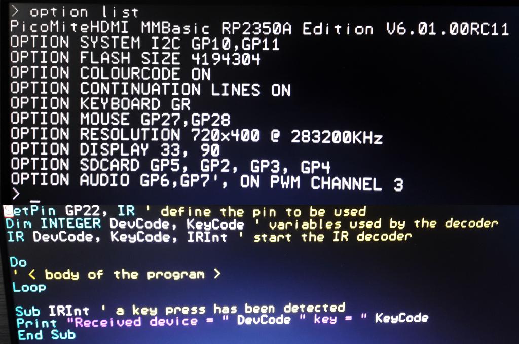 Hi Peter, I have possibly found a bug. IR doesn't work anymore. Observation: If I press on my (working two) remote controlls, the code is recognized, but only one single time, other key presses aren't. If I do a power off on the picoMiteHDMI, then the whole process repeats: only one single time the remote code is recognized, I have to reboot again. There isn't an error or so, but as said it only works for exactly one single time. On previous versions (but I don't know in which this "bug" (?) is introduced) everything worked. P.S.: I just tested a (previously working) second picoMiteHDMI, but with the USB firmware, exactly the same behavior! Ir receive just works for one single time. ![]() Greetings Daniel Edited 2025-11-13 00:26 by Amnesie |